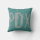 Throw pillow features PDX - Airport abbreviation for Portland International Airport, Portland, Oregon. Grungy urban gray text on teal background