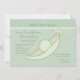 A sweet invitation, in a soft green color, featuring one pea in a pod. The top border has a baby paisley patter and a white, scalloped trim.