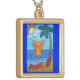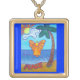 The Beach Angel Painting shows an yellow-orange angel hovering over the ocean. The word "joy" is on a cloud with a heart and has the sun peeking through. The word "peace" is written on the sand beach. A cheerful palm tree sways towards the guardian beach angel. Make a custom beach angel necklace and add your own text or images using the "Customize It" button for great angel pendant gifts!