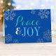 Modern and colorful corporate holiday greeting card features custom Peace & Joy text, a seasonal message, company photo and logo that can be fully personalized for your business. A border of platinum gray colored snowflakes provide accent this modern seasonal folded card design in vibrant wintery shades of royal blue, mint green, and white - which can all be modified.