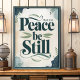 A vintage Christian typography piece with the words 'Peace Be Still' in a gentle, flowing script paired with a calming serif font. The background is a soft texture resembling aged parchment or linen. There are calming blue tones, soft greens, and muted gold accents. Delicate nature-inspired borders, like leaves or waves, are incorporated around the text.