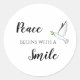 Sticker with the quote: Peace begins with a Smile. Written with a modern hand lettered style script in black. With a dove carrying an olive leafe, the symbol of peace.