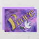 The word "Peace" is painted in a soft golden yellow against a pink and purple background. A dove of peace holds an olive branch in its beak. The watercolor painting has a textural contrast and sparkle from a light layer of glitter. Customize this invitation with your own text and resize the painting, as needed.