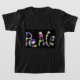 Wear a message of serenity and beauty with the "PEACE" in Flowers Art Print T-Shirt! This beautiful artwork showcases the word "PEACE" formed from a vibrant arrangement of colorful flowers against a striking black background.