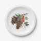 Paper plates with our Peace in Nature design featuring watercolors red cardinal, pine cones, and holly with red berries.