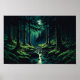 This poster features a breathtaking image of a dense forest at night, with the moon shining down on a small stream that flows between the trees. The serene and calming atmosphere of the forest creates a peaceful and relaxing environment that is perfect for any room in your home.