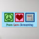 Peace Love Accounting. A cute accountant gift for a CPA who works in an office during tax season featuring a peace sign, heart, and cool calculator.