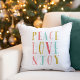 Custom holiday throw pillow with a whimsical typography design. Text says Peace Love and Joy. Abstract scattered dot pattern on reverse side. Click Customize It to add your own text and photos to design a one of kind pillow.