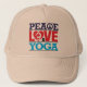 State what's really important to you with this hat featuring the words "Peace, Love, and Yoga". The letter "c" in the word peace is substituted with a peace sign, while the heart standing in for the letter "O" in love, contains a silhouette of a woman doing a yoga pose. Available with matching products.