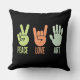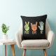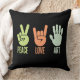 This bold and modern throw pillow features three iconic hand signs: the peace sign, the love hand gesture, and an open palm symbolizing art. With soft pastel tones of green, orange, and cream against a black background, this design delivers a simple yet powerful message: Peace, Love, Art.