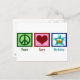A peace sign, a heart, and a cute birthday cake with a candle in it. A pretty birthday postcard to send to someone on their special day.