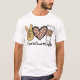 This fun and playful t-shirt design features a vibrant green background with a gold glittery peace sign, symbolizing harmony and tranquility. Above it, the phrase "Peace Love Coffee" is displayed in a cheerful font. Two charming heart-shaped icons accompany the peace sign: one with a stylish leopard print and the other showcasing a heartwarming cup of coffee with a gold heart detail. This design celebrates the simple joys of life – peace, love, and the comforting ritual of enjoying a delicious cup of coffee.