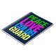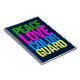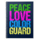 A cute colorguard gift for someone who performs flag spinning with the marching band in school. Peace Love Color Guard is written in pretty green, hot pink, blue, and neon yellow.