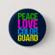 A cute colorguard gift for someone who performs flag spinning with the marching band in school. Peace Love Color Guard is written in pretty green, hot pink, blue, and neon yellow.