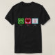 Peace sign, heart, and the breast cancer ribbon on black shirts.