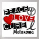 Peace Love Cure Melanoma – powerful words to live by and strive for. Share this inspiring sentiment with our Peace Love Cure Melanoma t-shirts, merchandise, and gifts featuring hip label text, a peace symbol, heart, and black Melanoma support ribbon.