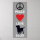 This customizable Peace Love Dogs product design with a peace sign, heart and dog silhouette makes a unique gift for dog owners and lovers.