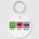 Cute Peace Love Donuts keychain featuring a pretty peace sign, heart, and a delicious chocolate donut with sprinkles. A fun bakery design for a baker with a sweet tooth for desserts.
