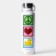 Personalized pretty gift for someone who loves a duck team mascot. A green peace sign, redheart, and a cute yellow rubber ducky. Peace Love Ducks water bottle.