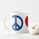 Peace, Love, Hot Dog with a peace sign, red heart and a frankfurter with mustard.