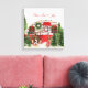 Canvas print with a cute and whimsical Christmas theme. A cozy trailer decorated for Christmas set among some pine trees. Peace, Love & Joy written across the top.