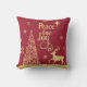 A beautiful Christmas Throw Pillow featuring a lovely faux Gold Glitter Christmas Tree with Snowflakes and a Reindeer on a Red background and a Gold Glitter Script with "Peace Love and Joy". At the back you can personalize it with your own Family name from the Personalize menu or delete it.