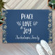 “Peace, love & joy.” A playful visual of whimsical, handwritten typography and champagne, antique gold snowflakes and confetti dots against a dark navy blue background, helps you usher in Christmas and New Year whenever you enhance your entryway with this stylish and unique custom personalized name Christmas welcome mat. Matching and coordinating cards, envelopes, stickers, giftwrap and other products are also available in my “Christmas Peace, Love & Joy” store collection. What a great way to celebrate this festive season and welcome all who enter your abode!