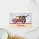 Flat thank you card with a cute christmas design. Image is a cute little toy truck with Merry Christmas hand painted on the side with gold lettering. Carrying a decorated Christmas tree in the back. The background is a silver bokeh pattern.