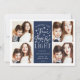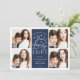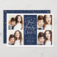 Modern typography based Hanukkah photo card features four of your favorite photos in a square format, with "Peace, Love and Light" centered in white hand lettered style typography. Personalize with your family name, individual names and/or your custom message. Cards reverse to a pattern of white snow and yellow stars on a navy blue background.
