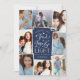 Beautiful typography based Hanukkah photo card features eight of your favorite family photos in a collage layout. "Wishing you peace, love and light this Hanukkah and always" appears in the center in white hand lettered typography on a navy blue background dotted with stars. Customize with your custom holiday greeting and family name.