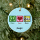 Pretty personalized musician Christmas ornament featuring a peace sign, heart, and a treble clef and musical staff. Cool custom PEACE LOVE MUSIC gift for a composer, music teacher, band director or choir conductor to give to their music students.