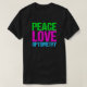A cool optometrist gift in bright neon green, pink, and blue on a bold black background reading Peace Love Optometry. A great gift for a doctor who helps patients with vision problems.