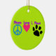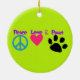 Cute graphic in colorful neon colors. 3 symbols - a peace sign, a heart and a paw, with the words peace, love and paws. For peace loving pet owners.