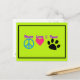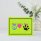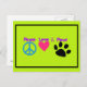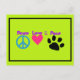 Cute graphic in colorful neon colors. 3 symbols - a peace sign, a heart and a paw, with the words peace, love and paws. For peace loving pet owners.