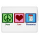 A peace sign, heart, and a prescription pill bottle on a cute greeting card for someone who works in a pharmacy.