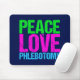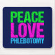 A cool phlebotomist gift featuring neon blue, green, and pink distressed font that reads Peace Love Phlebotomy. A great modern present for a technician who collects blood from patients.