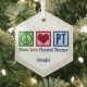 This cute physical therapist Christmas ornament gift features a pretty peace sign, heart, and the letters PT. A beautiful, personalized physical therapy present. Peace Love Physical Therapy.