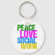 Cute personalized social worker gift in fun, bright colors of neon green, pink, blue, and yellow for someone who helps other people in need. Pretty Peace Love Social Work keychain.