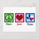 Peace Love Texas postcard. A cute Texan gift with a peace sign, heart, and the state of Texas flag.