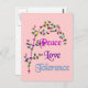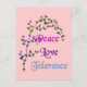 A wild rose bush with rainbow colored hearts drapes over the words "peace love tolerance" to get the message out that a more perfect world is anti-war, says no to hate, and practices true equality for all living creatures, human and animal.