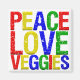 Peace Love Veggies shirts, apparel and gifts featured in a distressed, colorful design to display your dedication for the vegetarian lifestyle. Makes a great gift for vegans and vegetarians. Available on tote bags, coffee mugs, buttons, stickers, magnets and more.