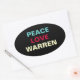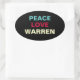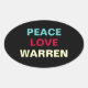 Support your favorite candidate with our campaign 2012 inspired PEACE LOVE WARREN Oval Sticker! Design features text in blue, red and white against dark background. Cool gift for Elizabeth Warren fans! Priced by the sheet with volume discounts available.