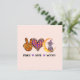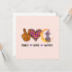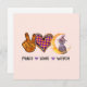 This playful Halloween greeting card features the phrase “Peace, Love, Witch” with three bold icons: a hand flashing the peace sign, a purple and orange checkered heart, and a witchy black cat curled inside a crescent moon. With vibrant colors and spooky-chic energy, it’s the perfect blend of retro fun and magical charm—ideal for witchy vibes all season long.