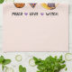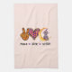 This playful Halloween kitchen towel features the phrase “Peace, Love, Witch” with three bold icons: a hand flashing the peace sign, a purple and orange checkered heart, and a witchy black cat curled inside a crescent moon. With vibrant colors and spooky-chic energy, it’s the perfect blend of retro fun and magical charm—ideal for witchy vibes all season long.