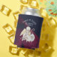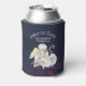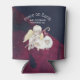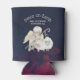 A christian themed can cooler. Designed with a sweet angel with yellow wings holding a shepherds crook. Sitting with white fluffy lambs. Navy blue and burgundy watercolor background, with tiny flecks of faux gold sparkle glitter (not actual glitter just a printed image). Text says: peace on earth and goodwill toward all.