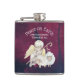 A christian themed flask. Designed with a sweet angel with yellow wings holding a shepherds crook. Sitting with white fluffy lambs. Navy blue and burgundy watercolor background, with tiny flecks of faux gold sparkle glitter (not actual glitter just a printed image). Text says: peace on earth and goodwill toward all.