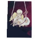 A christian themed gift bag. Designed with a sweet angel with yellow wings holding a shepherds crook. Sitting with white fluffy lambs. Navy blue and burgundy watercolor background, with tiny flecks of faux gold sparkle glitter (not actual glitter just a printed image). Text says: peace on earth and goodwill toward all. Merry Christmas from <name>.