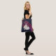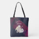 A Christmas tote bag. Designed with a sweet angel with yellow wings holding a shepherds crook. Sitting with white fluffy lambs. Navy blue and burgundy watercolor background, with tiny flecks of faux gold sparkle glitter (not actual glitter just a printed image). Text says: peace on earth and goodwill toward all.
