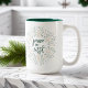 Sip hot chocolate or rich coffee from our festive and chic holiday mug featuring "peace on earth" in hand lettered brush typography encircled by a botanical wreath illustration in sage green, hunter green and flax. We love it with the matching hunter green interior for another pop of holiday color!
