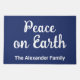 A lovely entry is like gift wrapping for your home. It's a sign that a nice time awaits those who enter. The script typography reads: Peace on Earth. At the bottom of the mat is space for personalization using your name or another message. Colors are dark blue with white typography. Make a great gift for the person or family who has everything. A useful gift that you took the time to personalize with them in mind is sure to please.